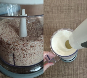 – Voeg het griesmeel met het bakpoeder toe en tenslotte de gemalen amandelen en het flesje (als je geen bittere amandelen kunt vinden)