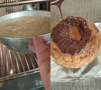 • – Vet de bolvormige bakvorm in en giet het mengsel erin en bak op 160°C gedurende 40-45 minuten (de priktest is altijd geldig)