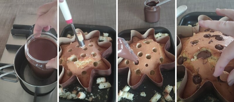 – Bij een warme taart, maak gaten op het oppervlak met een appelboor (erg handig) of met het handvat van een houten lepel en giet de smeerbare crème erin. Dek de gaatjes af met de resten verkregen met de appelboor.