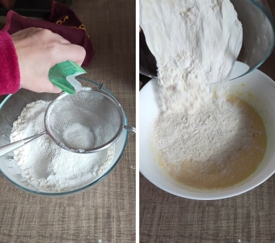 – Meng de bloem, aardappelzetmeel en bakpoeder goed door elkaar, zeef alles goed om klontjes en onzuiverheden te vermijden en voeg het dan toe aan het eierschuim.