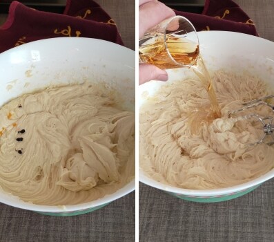 – Voeg de vanille, de geraspte mandarijnschil en tenslotte de likeur toe, goed mengen bij elke toevoeging met de kloppers op de laagste snelheid, of met de hand met een spatel. (als je ook kiest voor de chocoladedruppels, is dit het moment om ze toe te voegen)