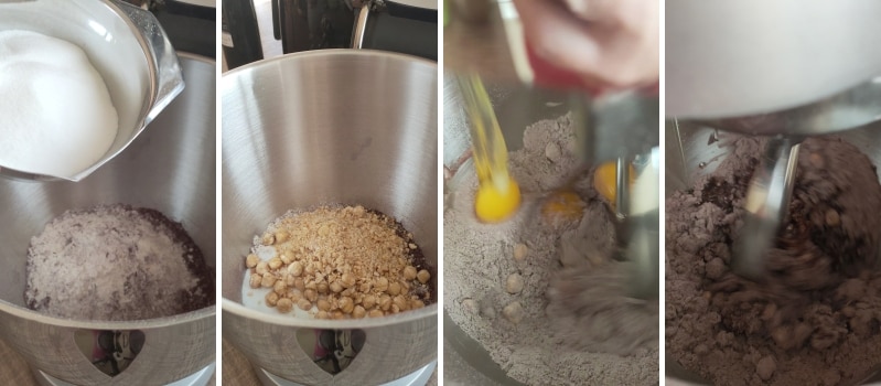 – Doe de droge ingrediënten en de hazelnoten in de kom van de keukenrobot; start de machine om de ingrediënten te mengen, voeg dan de eieren en de olie toe.