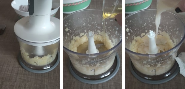 – Pureer de gekookte appel, voeg de olie en de plantaardige drank toe en zet even apart;