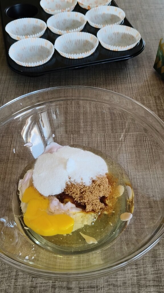 • In een andere kom, doe de yoghurt, de eieren en de suiker (toen ik het recept opnieuw maakte, gebruikte ik de helft kristalsuiker en de helft rietsuiker). Meng de ingrediënten.