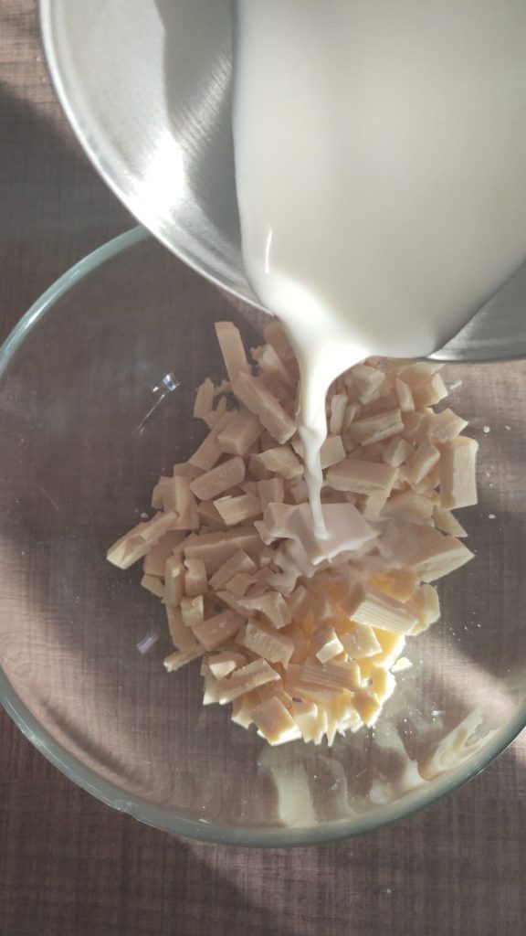 – Verzamel de chocolade in een kom en giet de kokende room erbij. Wacht een paar minuten en roer tot de chocolade volledig gesmolten is.