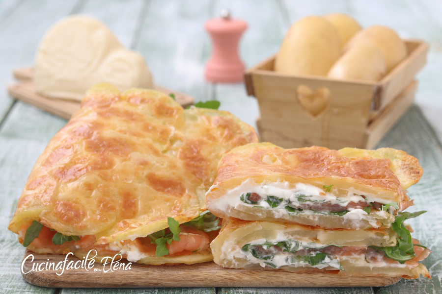 De aardappel sandwiches zijn een slimme en zeer eenvoudig en snel te maken recept. Ik wist niet wat ik moest maken voor het avondeten, dus pakte ik twee aardappelen, sneed ze in dunne plakjes en maakte rechthoeken die ik vervolgens met wat kaas bestrooide en bakte in de oven. En hier zijn heerlijke “broodjes” die de avondmaaltijd redden zonder deeg en zonder bloem, perfect om naar eigen wens te vullen. Ik deed er smeerkaas, gerookte zalm en rucola in, maar je kunt kiezen wat je maar wilt, ook vlees, vleeswaren, groenten, tonijn en verschillende kazen. De aardappel sandwiches zijn zacht en knapperig tegelijk, perfect voor een smakelijk en voedzaam avondmaal, je zult ervan houden!