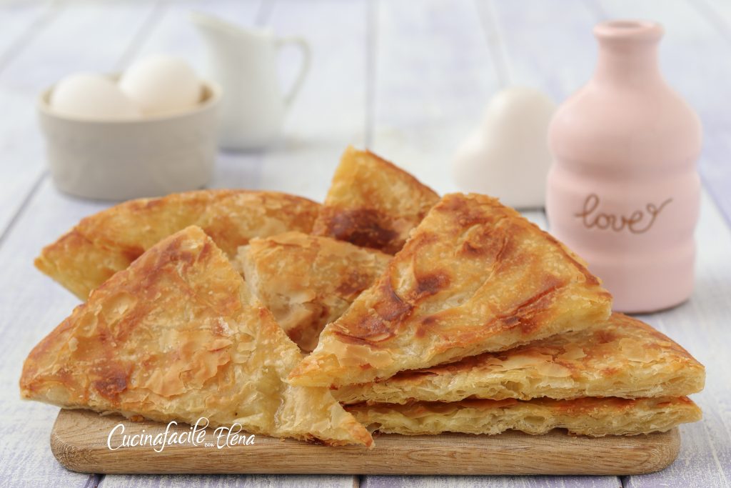 • Na het laatste vel filodeeg te hebben gelegd, vouw je de randen naar het midden toe, bestrijk je het oppervlak met de resterende massa, dek af met een deksel en laat de gelaagde focaccia op matig laag vuur ongeveer tien minuten koken, het moet goudbruin zijn.