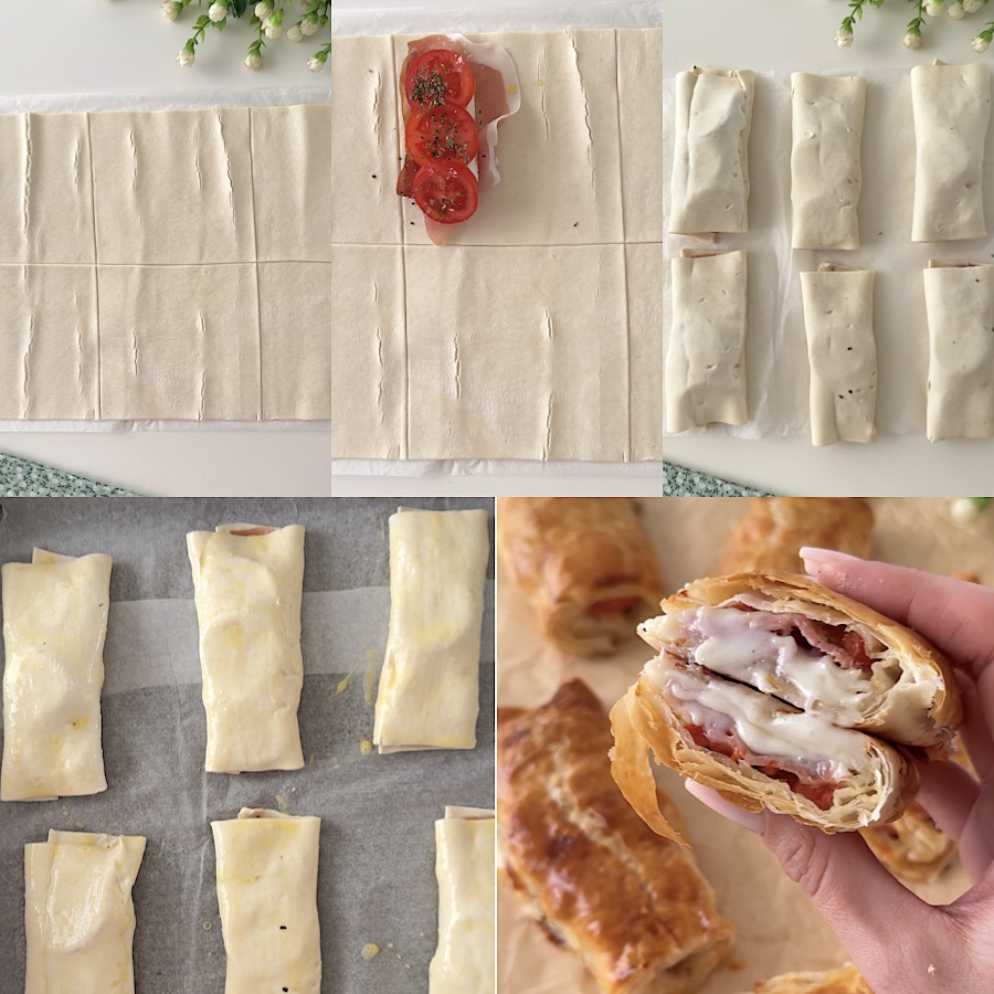 • De hartige bladerdeegpakketjes zijn heel eenvoudig en snel te maken, rol eerst de rol bladerdeeg uit en snijd deze in 3 verticale delen en vervolgens doormidden, zo krijg je 6 stukjes.