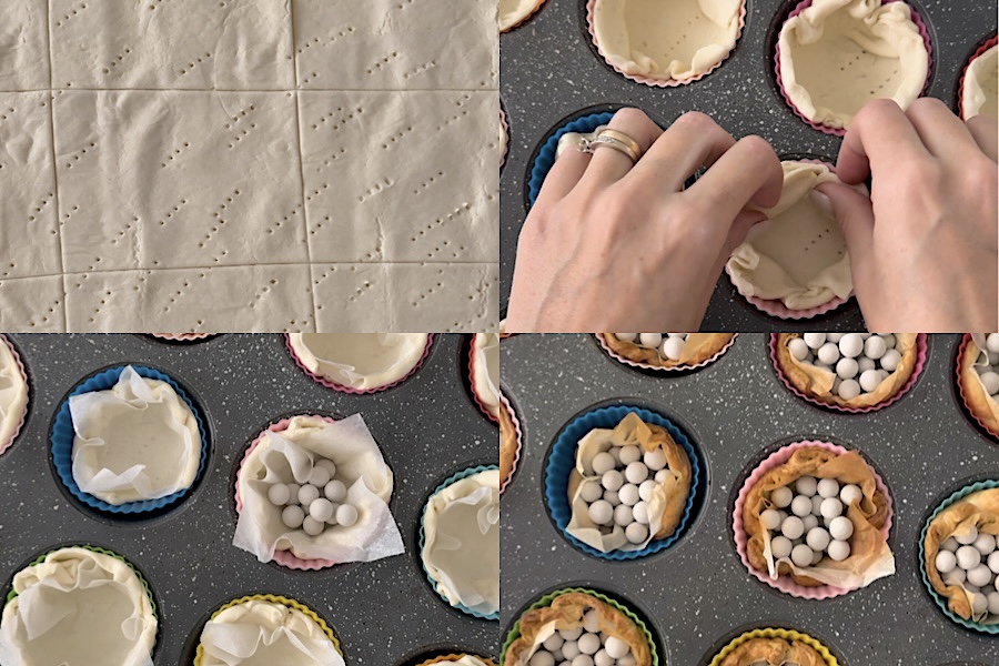 Neem het bakpapier van het bladerdeeg en snijd 12 stukjes, plaats ze dan bovenop het bladerdeeg en leg er keramische bakbonen op (ik heb DEZE, ze zijn ook heel handig voor taarten, koekjes en dergelijke, als alternatief kun je kikkererwten of bonen gebruiken, die je daarna uiteraard niet meer kunt consumeren), op deze manier behouden de mandjes perfect hun vorm.