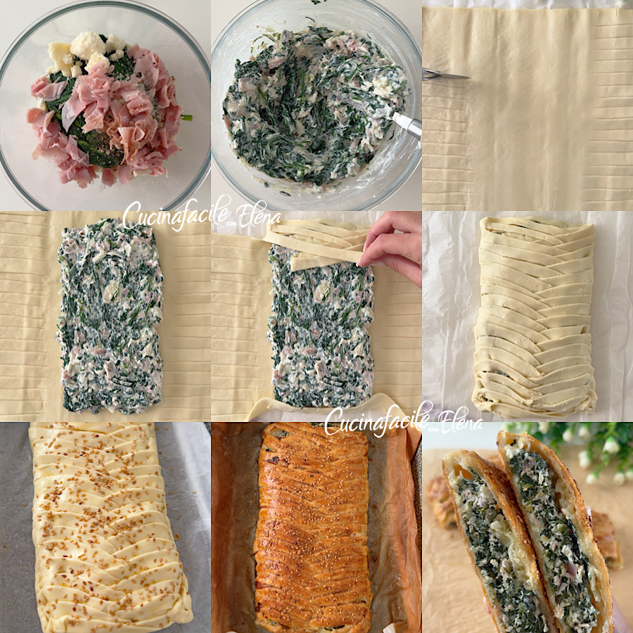 Vul het middelste deel van het deeg met de ricotta-spinazievulling en sluit het deeg door de reepjes boven de vulling afwisselend te vlechten.