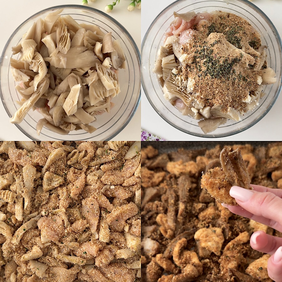 De kipreepjes met champignons zijn heel eenvoudig en snel te bereiden, snijd eerst zowel de kipfilet als de pleurotus champignons in stukjes, doe ze in een kom en breng op smaak met zout, peper en kruiden naar keuze (ik heb rozemarijn en tijm toegevoegd).