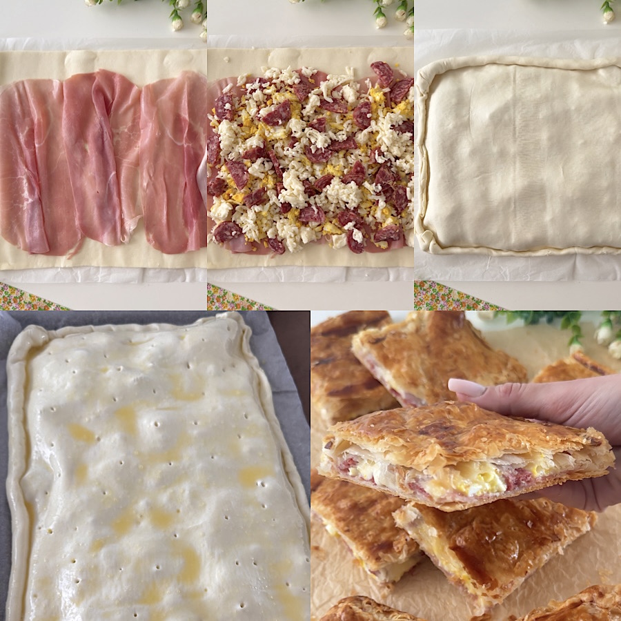 • Rol een rol bladerdeeg uit en beleg deze met plakjes gekookte ham, wat geraspte scamorza met een grove rasp, verkruimelde hardgekookte eieren, in kleine stukjes gesneden salami en de overgebleven geraspte scamorza.