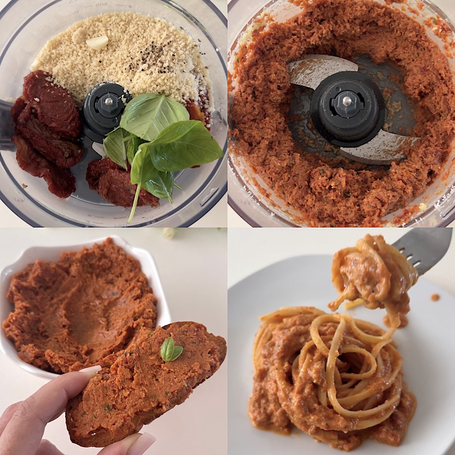De pesto van zongedroogde tomaten is heel eenvoudig en snel te maken, allereerst doe je in een keukenmachine de zongedroogde tomaten, de geraspte Parmezaanse kaas, het amandelmeel (of de hele gepelde amandelen, in dat geval, mix ze eerst tot je een soort van meel hebt), de basilicum, het teentje knoflook, een snufje peper en de extra vergine olijfolie.