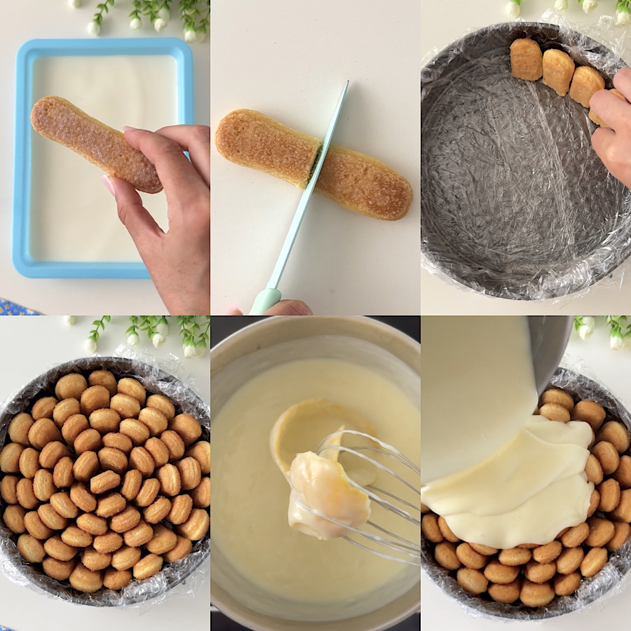 De savoiarditaart met room is heel eenvoudig en snel te maken. Neem eerst de savoiardi, dompel ze snel in de melk en snijd ze doormidden. Plaats ze vervolgens in een met plasticfolie beklede taartvorm, zodat de gesneden kant in contact komt met de basis. Als er wat kleine ruimtes zijn, is dat prima, ze hoeven niet te dicht op elkaar te zitten.