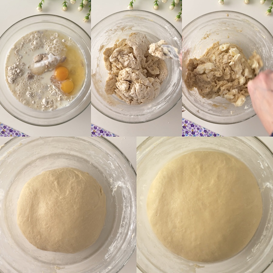 Voeg de boter op kamertemperatuur toe, geef snel een roer met de vork en voeg dan ook de vanille en een snufje zout toe. Vorm een zacht en compact deeg en laat het in de kom rijzen, afgedekt met een theedoek, voor een paar uur.