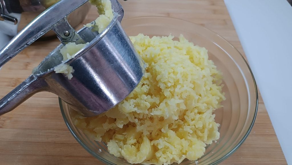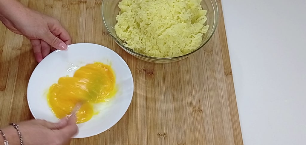 Klop de eieren en voeg ze toe aan de aardappelen samen met het zout en de kazen.