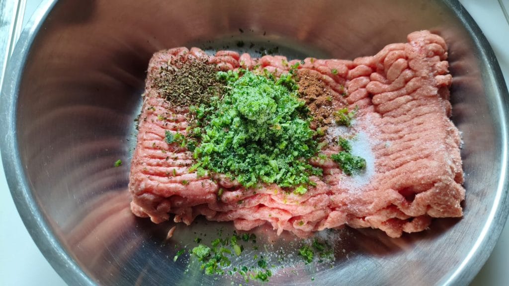 Om de balletjes in tomatensaus te maken, begin je met het mengen van het gehakt en de worst in een kom met het zout, de peterselie en de oregano.