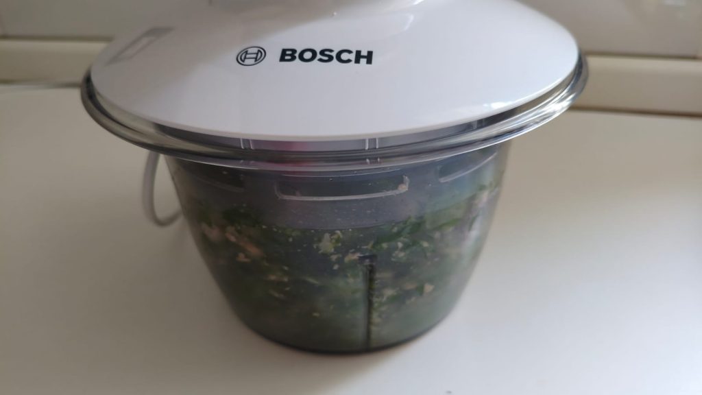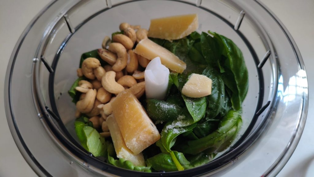 De echte doorbraak? Ik heb cashewnoten in plaats van pijnboompitten gebruikt! Ik weet het, pijnboompitten zijn de klassieke keuze, maar laten we eerlijk zijn… ze kosten een fortuin 😅. Cashewnoten daarentegen zijn goedkoper en geven een waanzinnige romigheid. Ik heb een teentje knoflook toegevoegd, wat geraspte Parmigiano Reggiano en een goede extra vergine olijfolie. Binnen een paar minuten had ik een heldergroene saus, perfect om pasta mee op smaak te brengen, op crostini te smeren of zelfs als basis voor een alternatieve pizza te gebruiken.