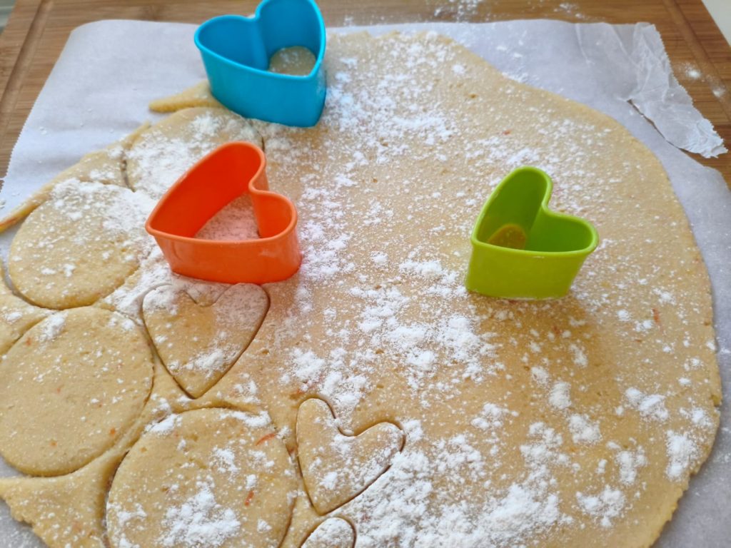 Steek de koekjes uit met de vormen die je leuk vindt (harten, sterren, poppetjes… alles mag!). Leg ze op een met bakpapier beklede bakplaat.