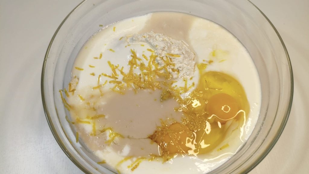 Los de gist op in het water en voeg in een kom de bloem, de kefir of yoghurt, de eieren en de citroenschil toe