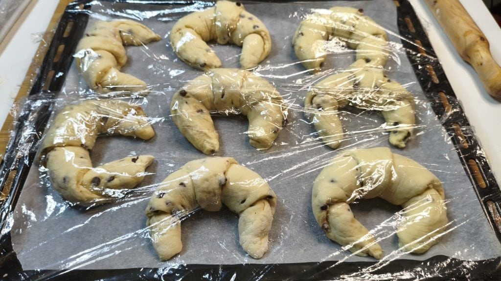 Neem het deeg terug en voeg de chocoladestukjes toe. Maak een ronde van vouwen zodat de stukjes zich in het deeg opnemen en sluit af met plastic folie.