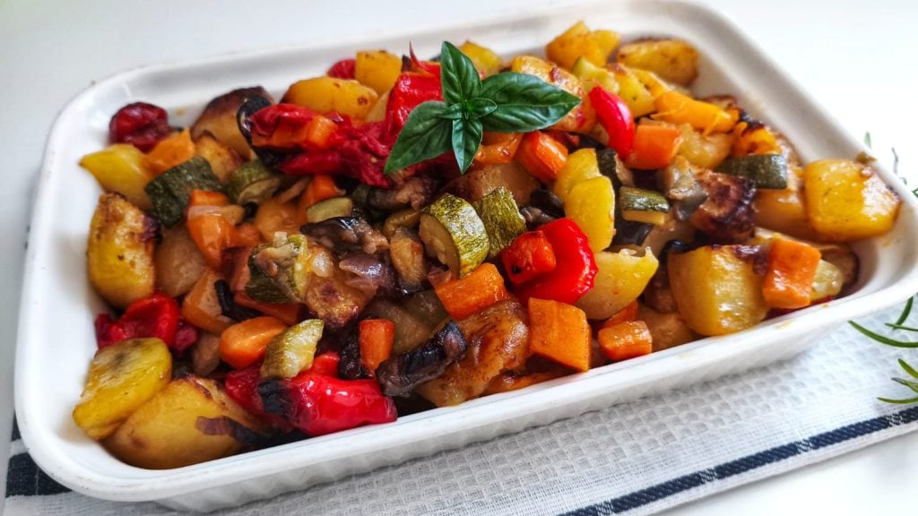 Het mooie aan deze caponata uit de oven is dat er niets gefrituurd hoeft te worden. Snijd gewoon de groenten — ik heb ui, bleekselderij, wortel, aubergine, paprika, courgette, een paar aardappelen en wat cherrytomaatjes gebruikt — en leg ze allemaal in een grote ovenschaal. Een flinke scheut extra vergine olijfolie, zout, peper, en dan in de oven! In minder dan een uur heb je een geurige, kleurrijke en gezonde bijgerecht, ideaal zowel warm als koud.😊