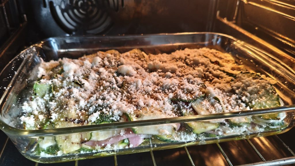Giet een scheutje olijfolie op de bodem van een ovenschaal en strooi een beetje paneermeel. Maak lagen van gegrilde courgette, gekookte ham, mozzarella en Parmezaanse kaas tot alle ingrediënten op zijn.