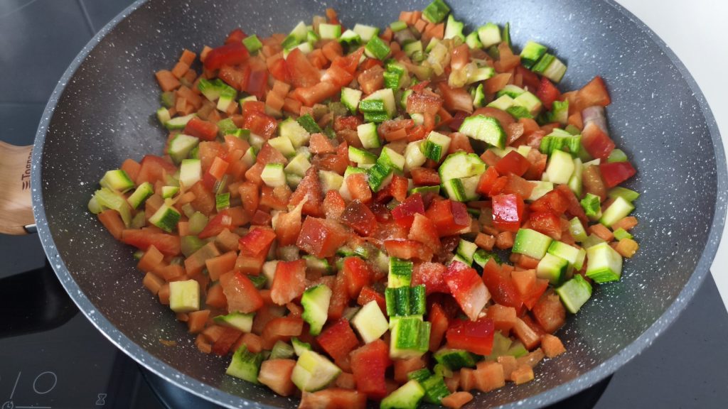Begin met het wassen en schoonmaken van alle groenten. Snijd wortels, paprika, selderij en courgettes in kleine blokjes, zodat ze gelijkmatig garen. Verhit in een anti-aanbakpan een beetje olie en bak de fijngesneden sjalot zachtjes, voeg dan de groenten toe.