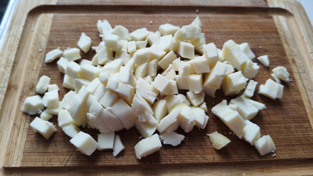Snijd de Galbanino in blokjes en voeg deze toe aan de groenten.