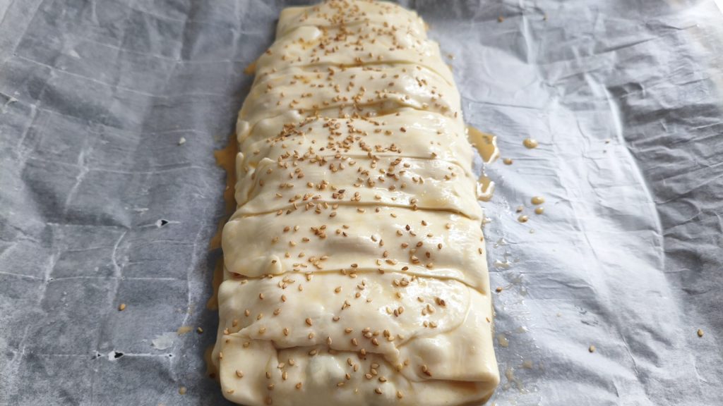 Bestrijk het oppervlak royaal met losgeklopt ei en bestrooi met een laagje sesamzaadjes. Dit geeft een geweldige geur en extra krokantheid.