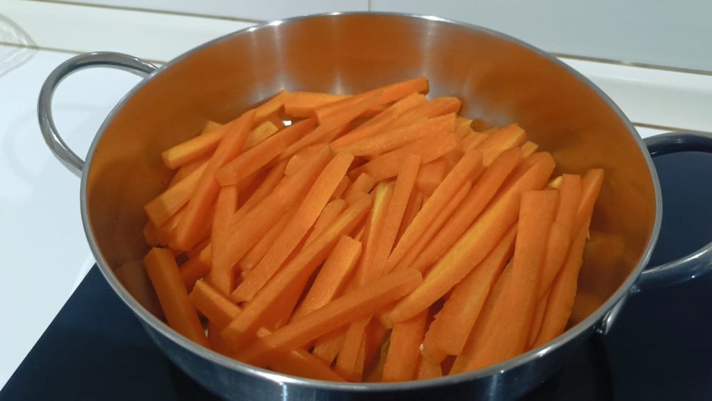 • Om de wortelen met melk te bereiden, begin je met het wassen en schillen van de wortelen en ze vervolgens op de gewenste manier te snijden. Ik heb ze in reepjes gesneden.