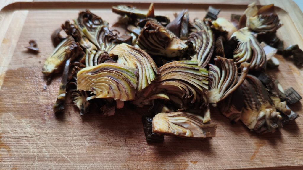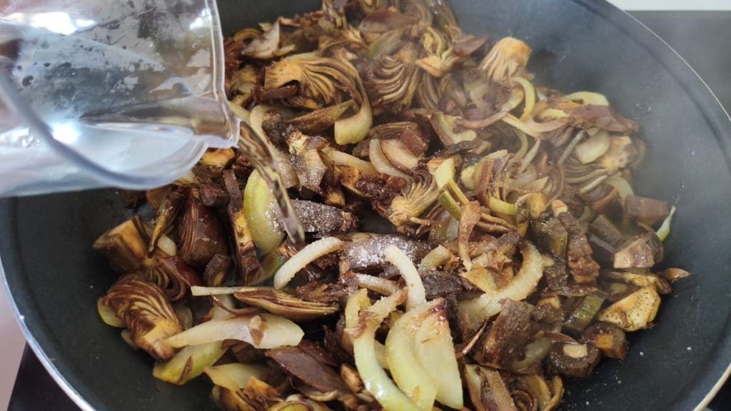 • In een pan een fijngesneden ui fruiten met een scheutje olie, voeg de artisjokken toe en zout naar smaak.