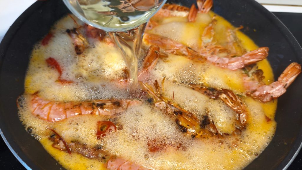 Voeg de garnalen toe in de pan en probeer ze niet te overlappen, bak ze ongeveer twee minuten aan elke kant.