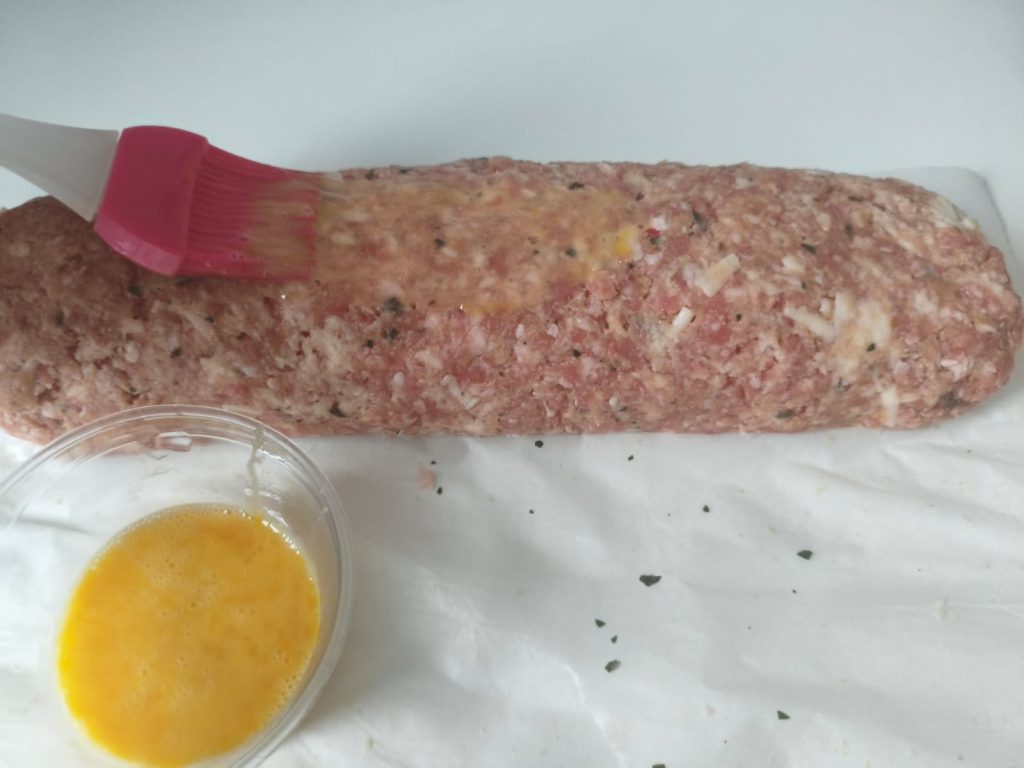 Bestrijk het gehaktbrood met een mengsel van geklopt ei en melk. Rol het door het paneermeel en leg het in een met bakpapier beklede bakplaat.
