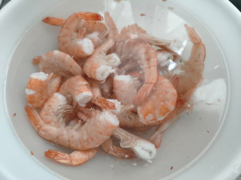 Snijd de helft van de garnalen in stukjes en laat de rest geheel.