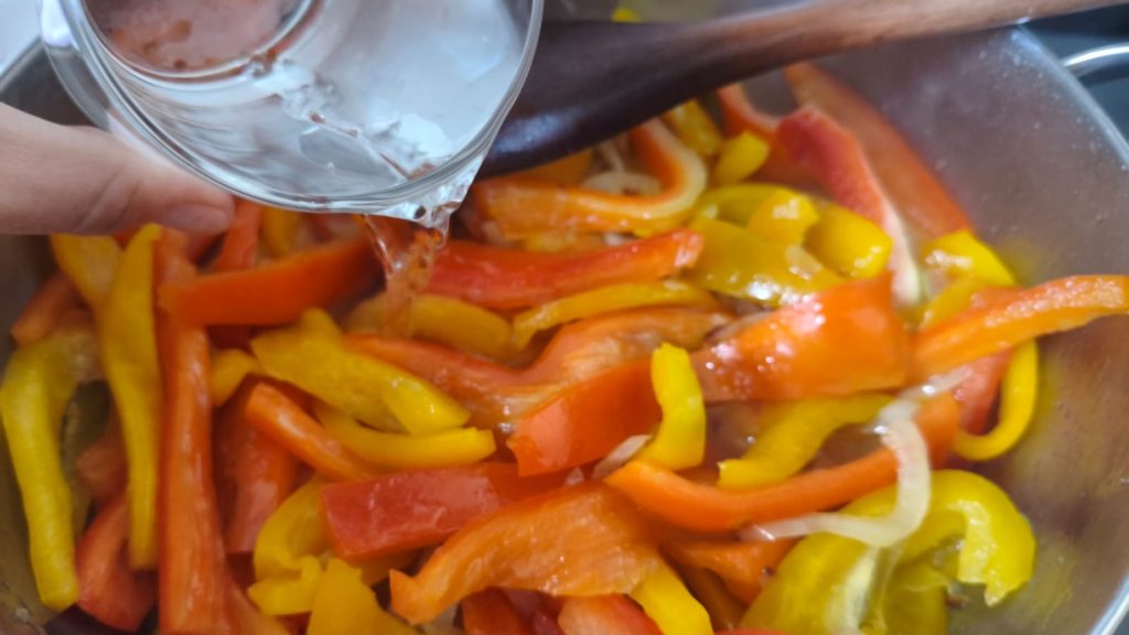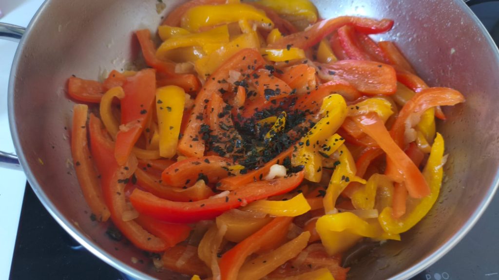 Voeg de paprika’s toe aan de ui en laat ze een paar minuten op smaak komen, pas dan het zout aan.