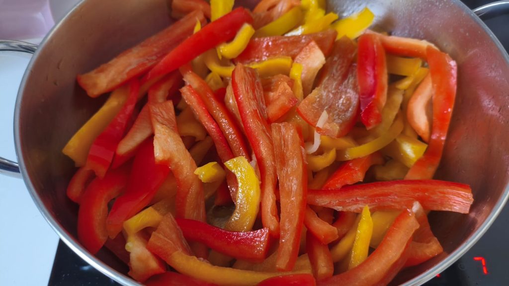 Terwijl de ui aan het koken is, was en snijd de paprika’s in reepjes.