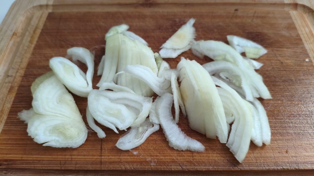 Begin het recept van de zoetzure paprika’s door een ui fijn te snijden en deze in de pan te plaatsen met een scheutje olie.