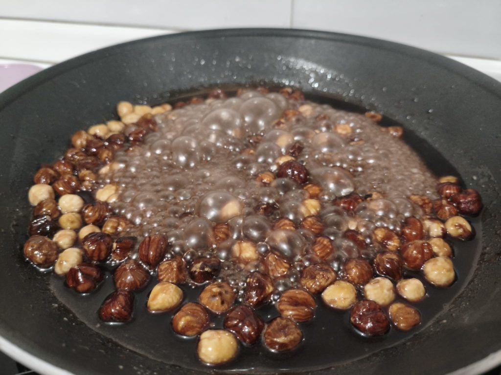Houd het vuur middelhoog tot laag en blijf continu roeren. Het is belangrijk om geduldig te zijn: de suiker moet eerst smelten, kristalliseren en vervolgens de hazelnoten bedekken.