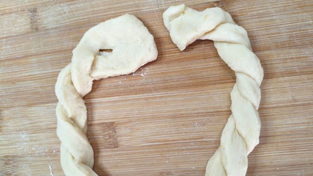Snijd in stroken van ongeveer 3 cm breed en verdeel in tweeën en laat het aan elkaar hechten.
