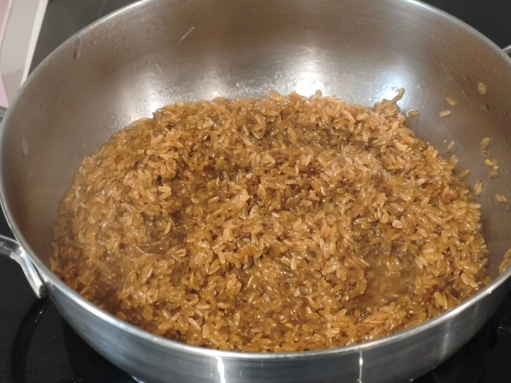 Halverwege de kooktijd voeg je de rode koolcrème toe en kook verder tot de rijst beetgaar en romig is.