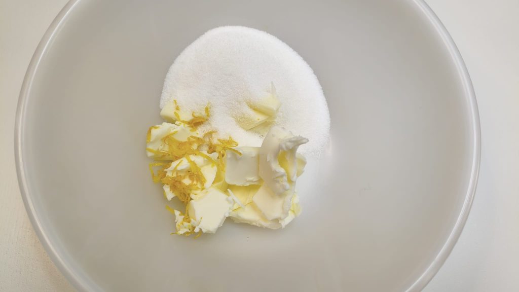 Bereid het zanddeeg: meng in een kom suiker of erythritol, citroenschil en boter in stukjes. Werk snel tot een zanderig mengsel, voeg de eieren en de bloem toe en kneed tot een bal.