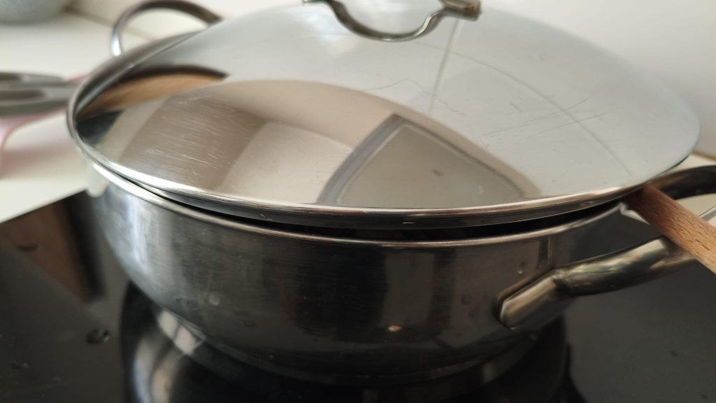 Zout toevoegen en afdekken met een deksel, 40 minuten op laag vuur laten koken en indien nodig water toevoegen.