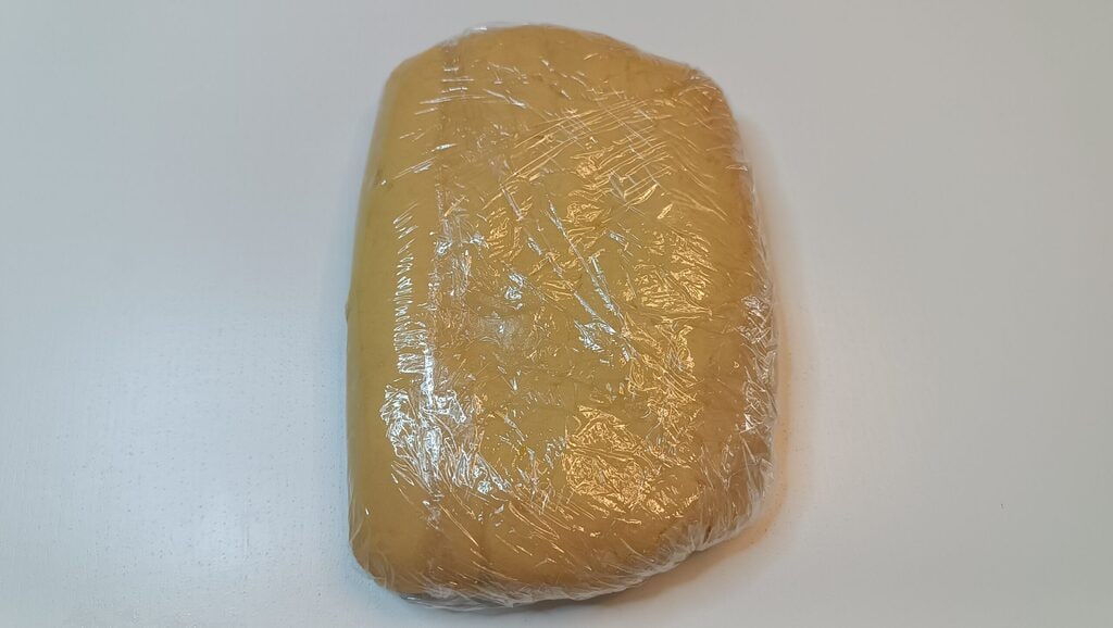 Wikkel het deeg in plasticfolie. Laat 30 minuten in de koelkast rusten.