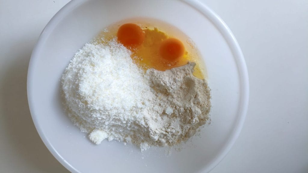Om het kokoszanddeeg te maken, begin je met het combineren van de eieren, de bloem en het kokosmeel in een kom.