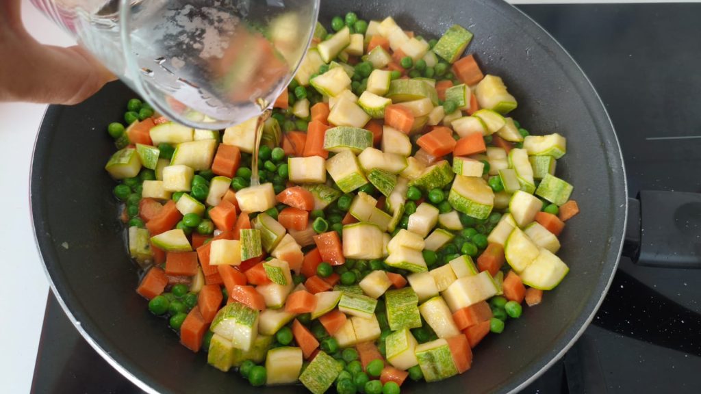 Om koude pasta met courgettes, wortels en erwten te bereiden, begin je met het wassen van de groenten, verwijder de uiteinden en snijd ze in blokjes. In een pan een teentje knoflook in een scheutje olie laten smaken en de gesneden groenten en erwten toevoegen.