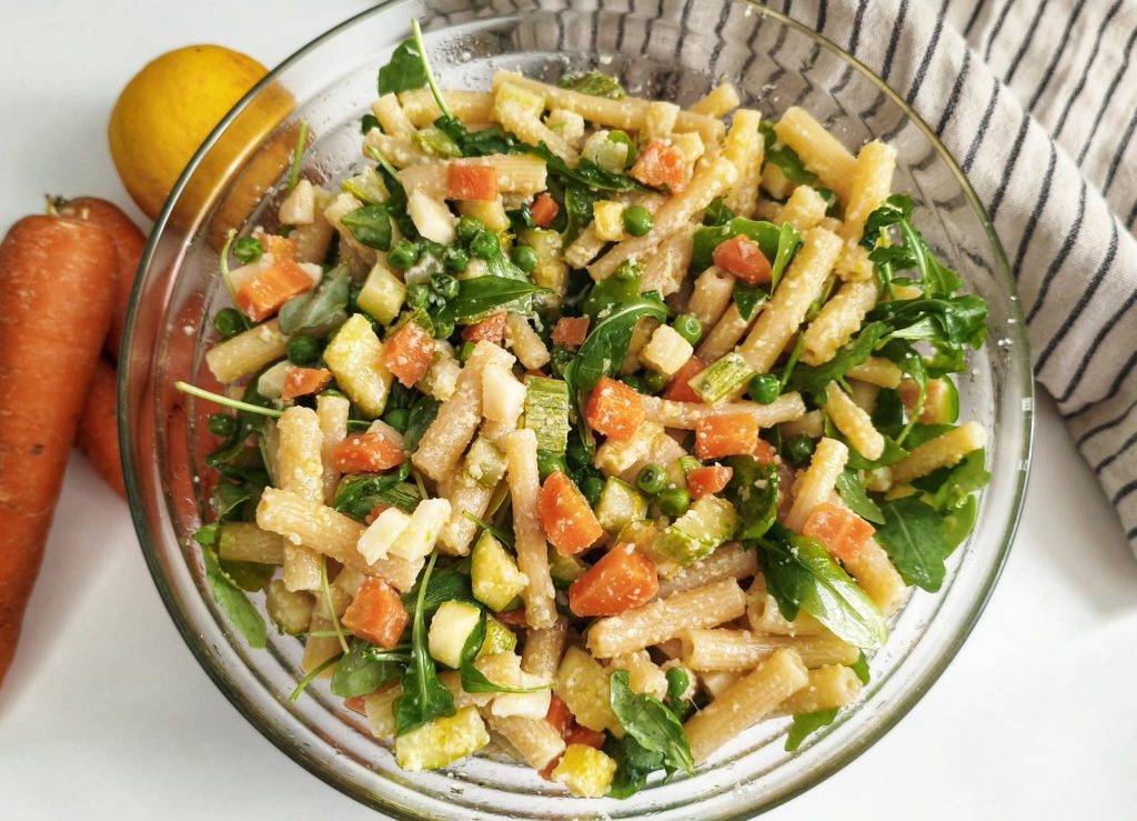 Hier is hoe je koude pasta met courgettes, wortels en erwten bereidt