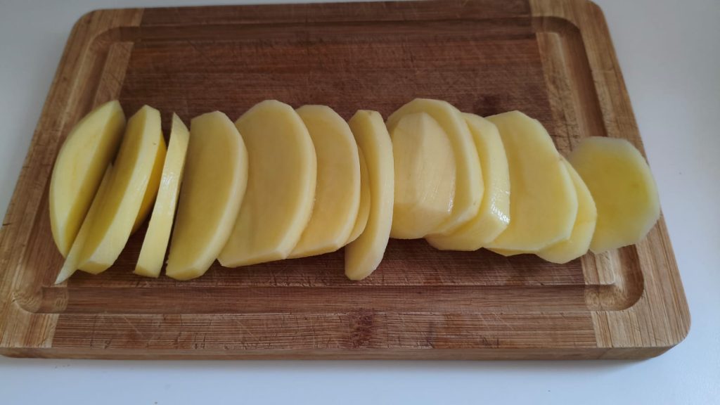 Het bereiden van de omelet van vlees en aardappelen is heel eenvoudig: schil, snijd en was de aardappelen en kook ze in gezouten kokend water.