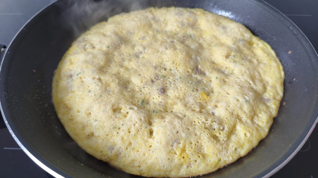Als je een eiwitrijke en voedzame omelet wilt, is dit de juiste keuze. Het vlees geeft smaak en textuur, terwijl de aardappelen het zacht en omhullend maken.