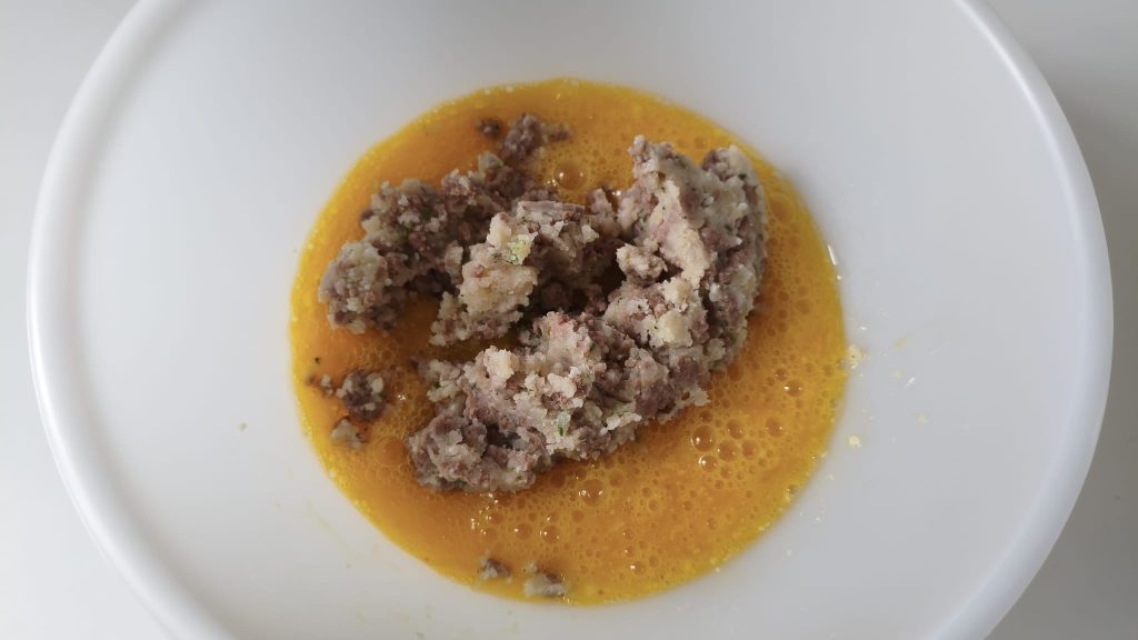 Voeg de afgekoelde aardappelen en het vlees toe aan de eieren en meng goed. Verwarm een scheut olie in een pan en giet het eimengsel erin.